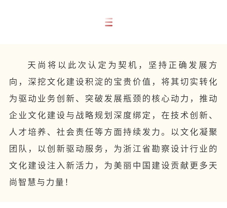 天尚設計集團的發展歷程,始終以文化為內核突破前行:從早期聚焦建筑、園林領域的單專業設計,到整合建筑、景觀、裝飾、市政等多領域資源,構建覆蓋“設計-落地”全流程的綜合性服務體系,再到創新打造以頂層設計為引擎、產業價值為導向,聯動勘察、咨詢、監理、造價等專業服務的“1+1+N”全過程咨詢模式,每一次打破行業邊界的跨越式發展,都離不開企業文化的深度賦能。“天成自然,尚美中國”的核心口號指引服務方向,“共創、共建、共享”的價值觀凝聚團隊力量,“追求卓越、協同共贏”的理念驅動模式突破,文化如貫穿始終的脈絡,為企業提供源源不斷的精神滋養與行動指引。